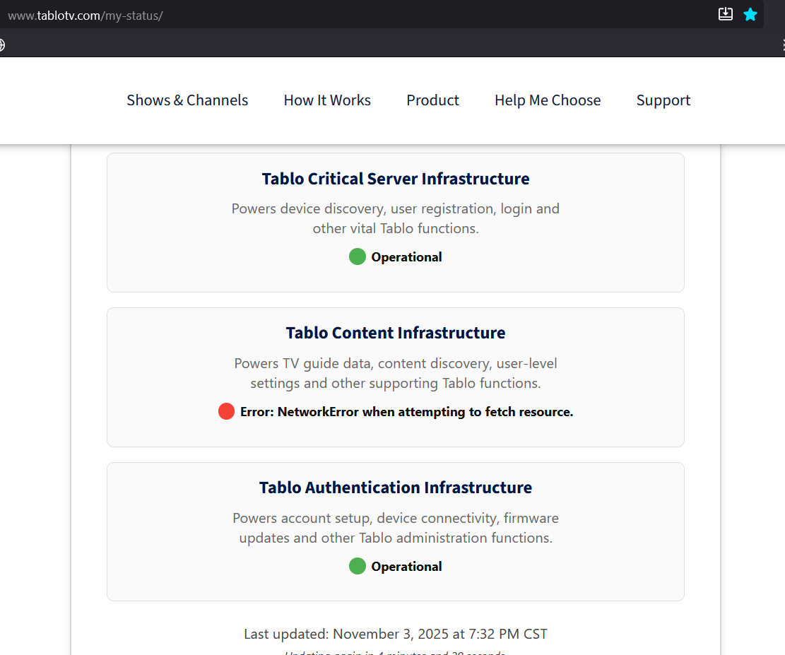 Only consolation is the Tablo Status page reports the outage so at least I know what is happening.