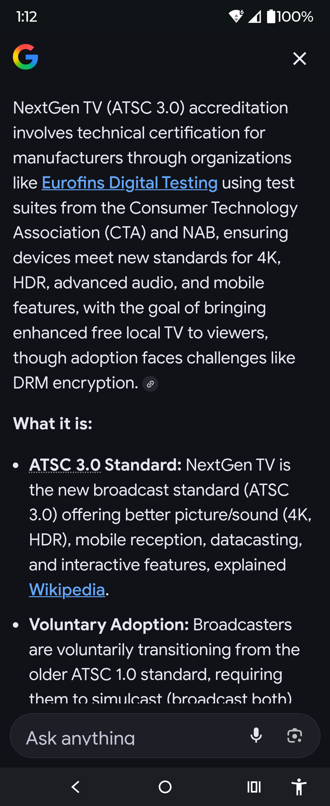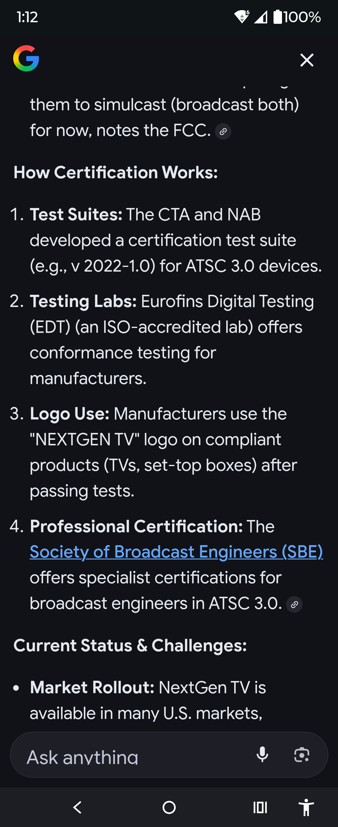 ATSC 3.0 product certification involves independent labs like Eurofins Digital Testing for conformance and NEXTGEN TV logo testing, and component providers offering certified solutions, ensuring devices meet standards for security, interoperability, and features like emergency alerts and interactivity. Manufacturers license technology (like from Avanci Broadcast) and get tested to ensure their receivers (TVs, dongles) function correctly and securely.