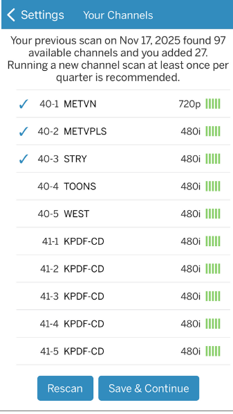 Screenshot 2: Scan is complete and after a brief moment, a service “converts” major networks names before your eyes to network designations, which is what you see in this screenshot. In this example, I currently have 27 channels, but will select a 28th “TOONS” (40-4) by clicking “Save & Continue”