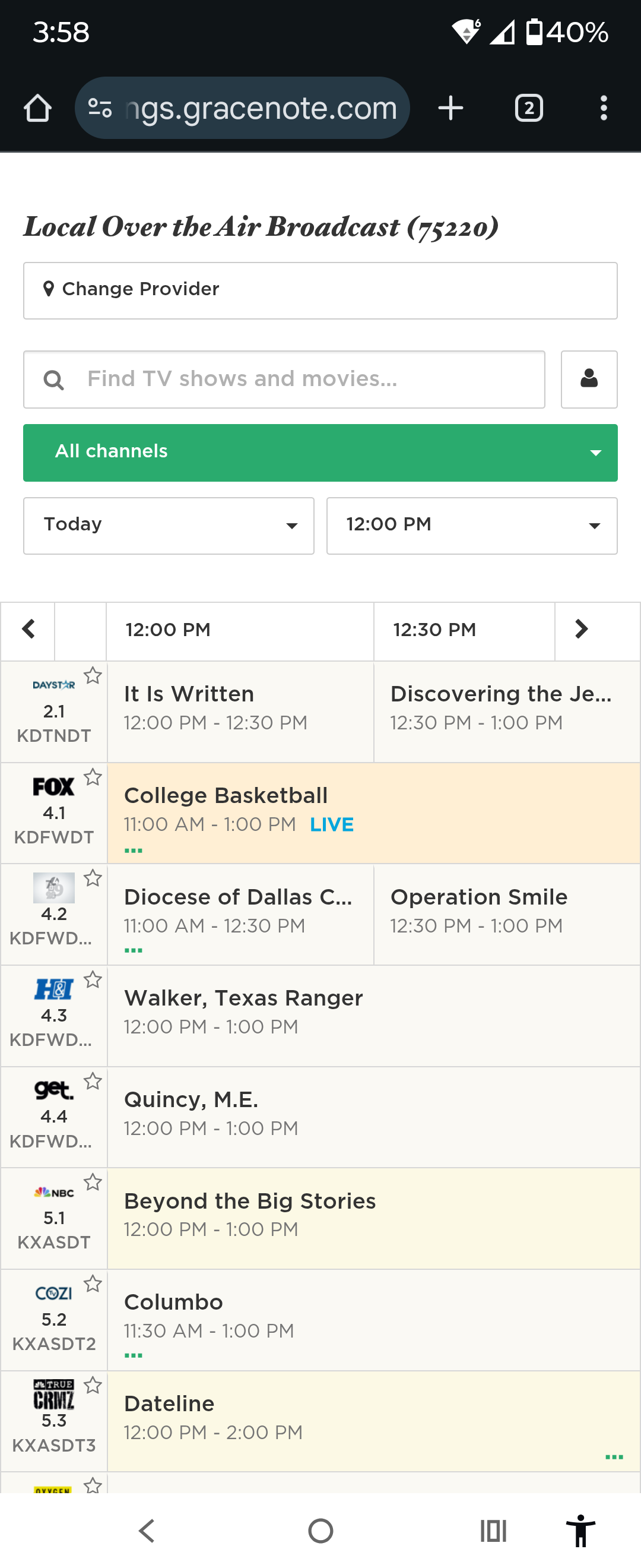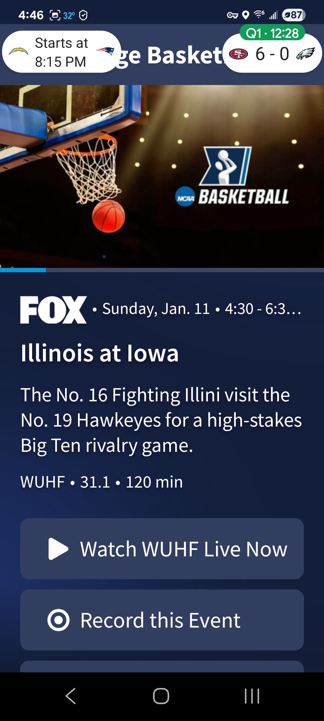 Fox channel guide is showing college bball instead of nfl playoff game