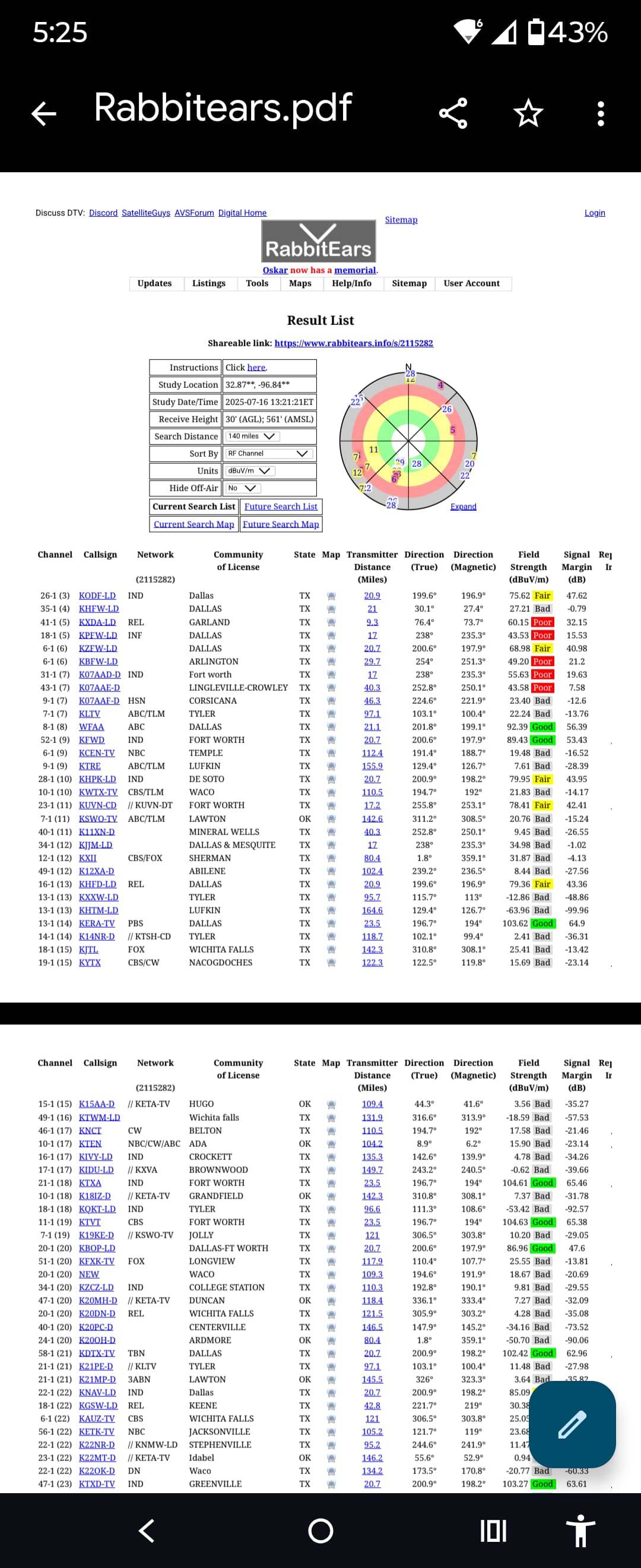 My “real” experience with a good quality antenna (Televes Ellipse Mix) located within the HOA 6’ height limitation above my one-story roof is I can get good quality signals from both local antenna farms. Further, the transmitter database details on Rabbitears.info are incorrect for at least 2 transmitters as there have been changes in the last 2-3 years that are not reflected even today.