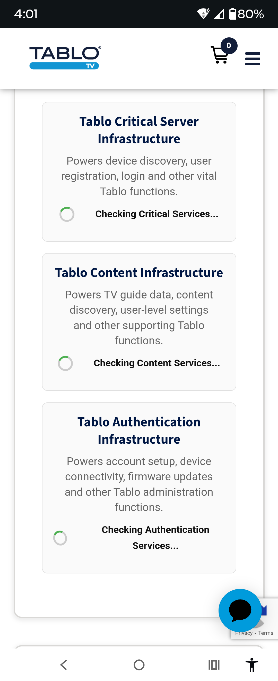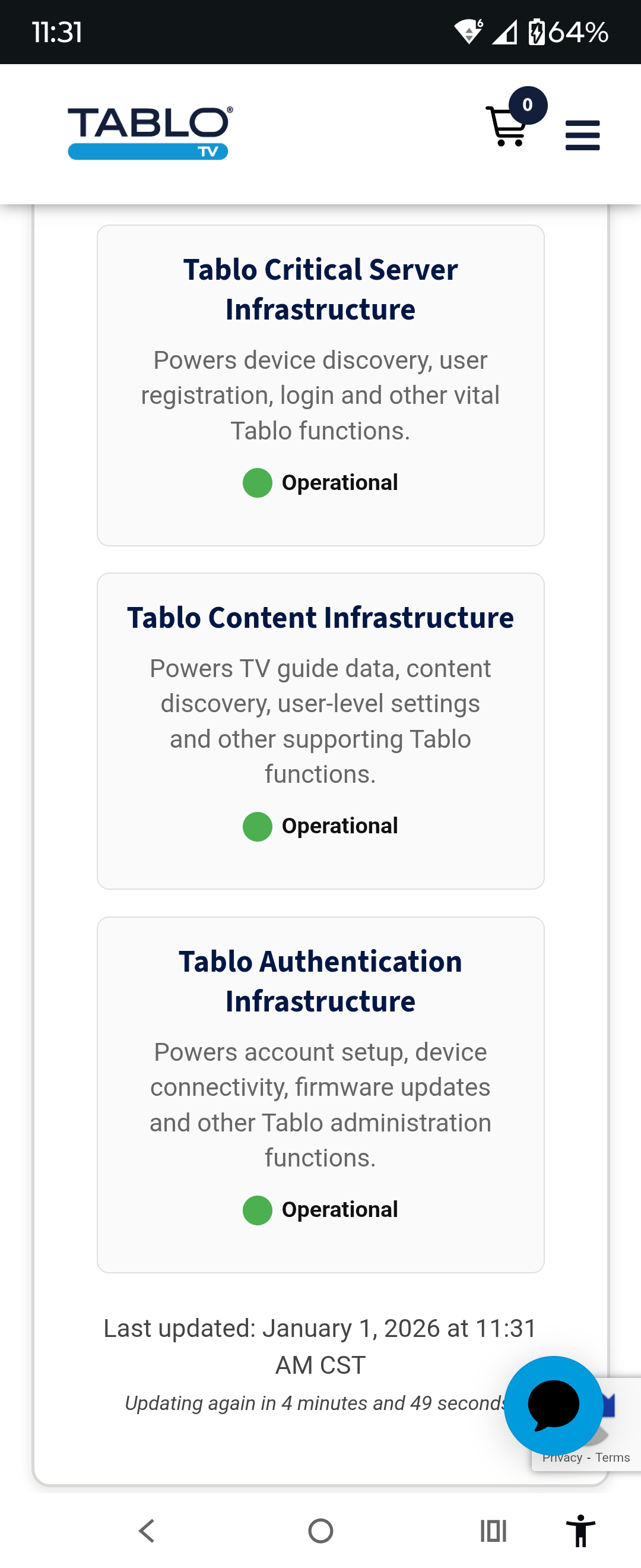 Till now; status page says all is OK, just that the Tablo homepage is a jumble, OTA grid is blank, IOW no live OTA since there is nothing to select.