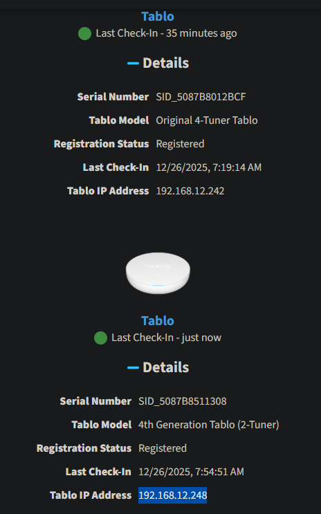 I have two Legacy Tablos. Currently, Legacy Tablos are not included on the Tablo status page but one of my Legacy Tablos is in the Beta proram testing the Gen4 updates and is the first one on the list. I occassionally see a second Tablo on my status page and it is never my other Legacy Tablo (confirmed by SID and IP address). It always seems to be a random visitor. I think my last random vistor Tablo was named Evie. I also confirmed That 192.168.12.248 is not a Tablo lurking on my LAN. I think this is more of a programming issue where non-redident Tablos are being incorrectly matched to resident Tablos by some criteria such as subnet or something else.