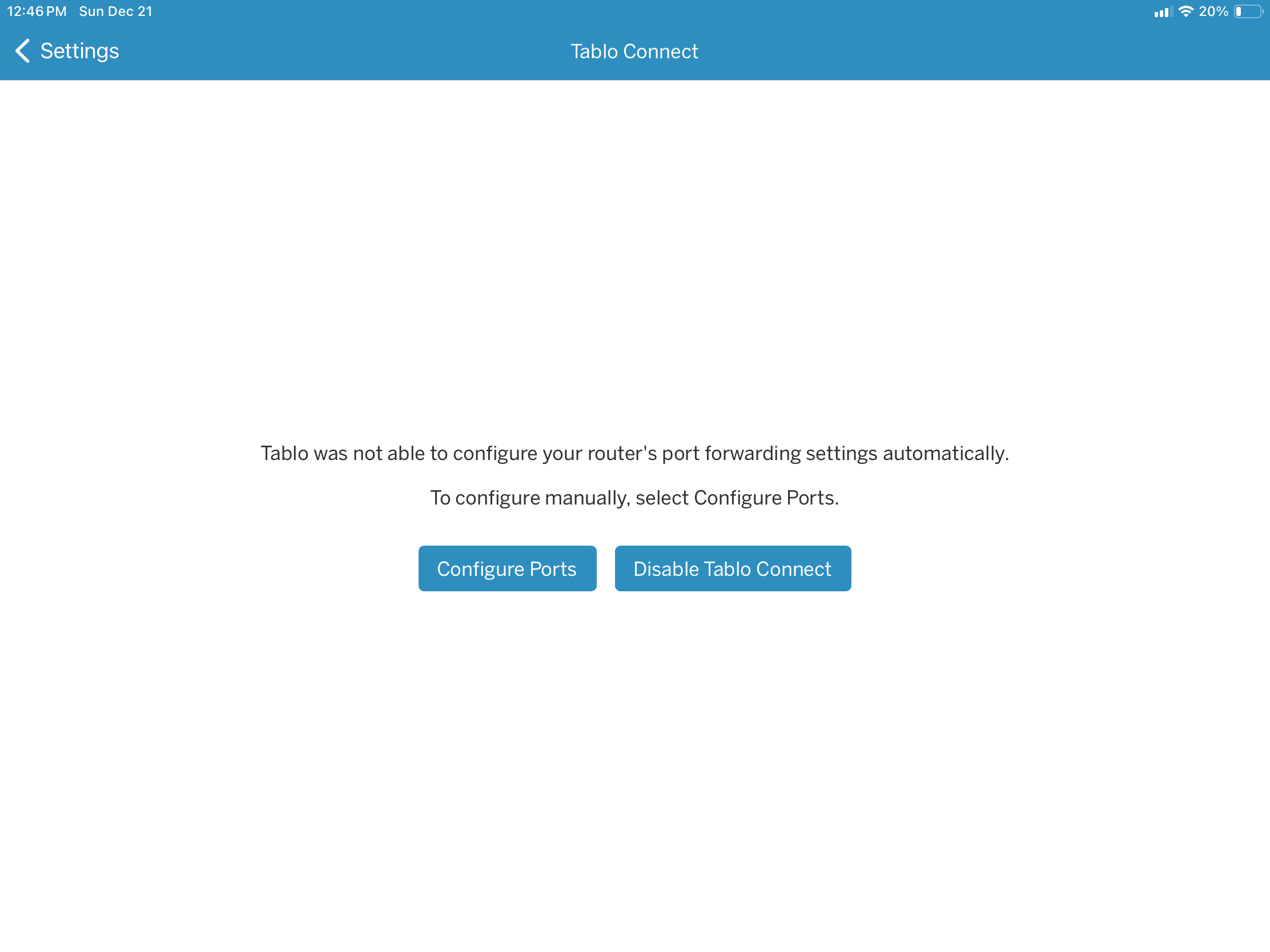 Here is some additional info on my situation. When I go to my Tablo’s settings section, from my iPad, I see that there is a “warning” type indicator under “Tablo Connect.” (See attached pic).