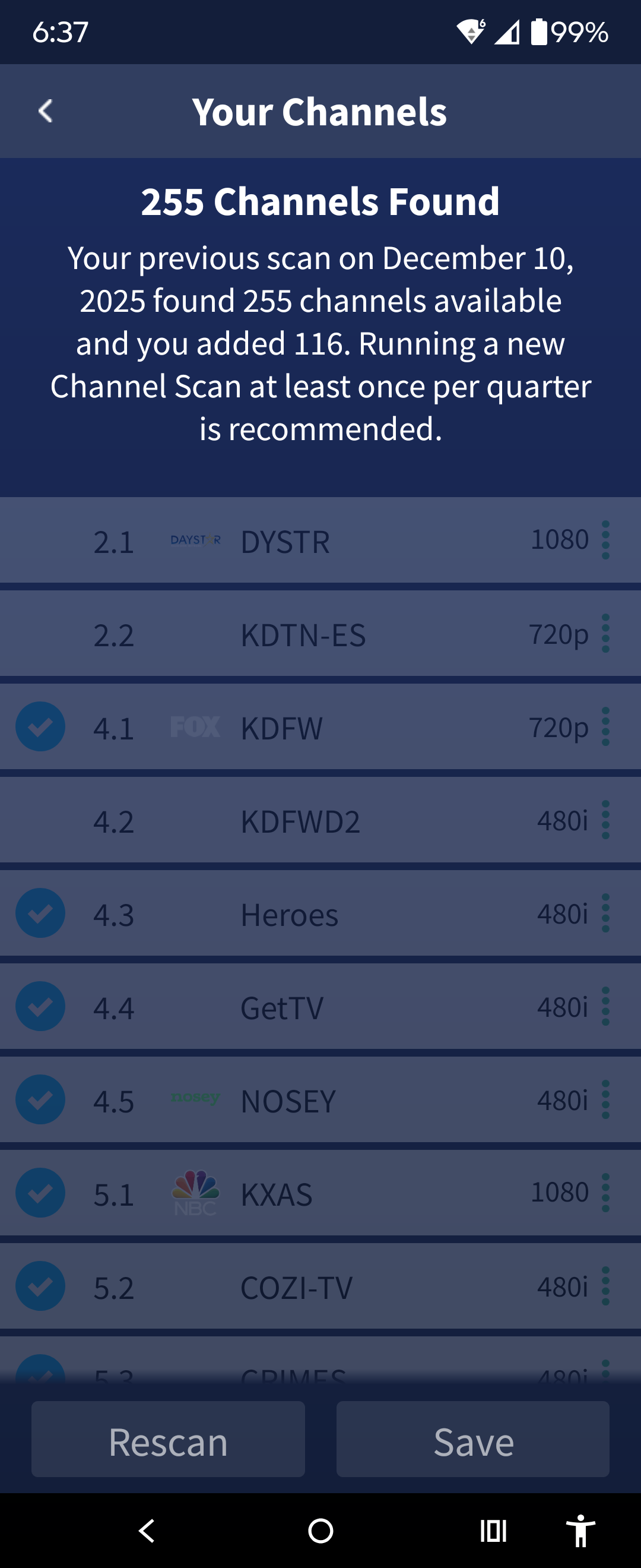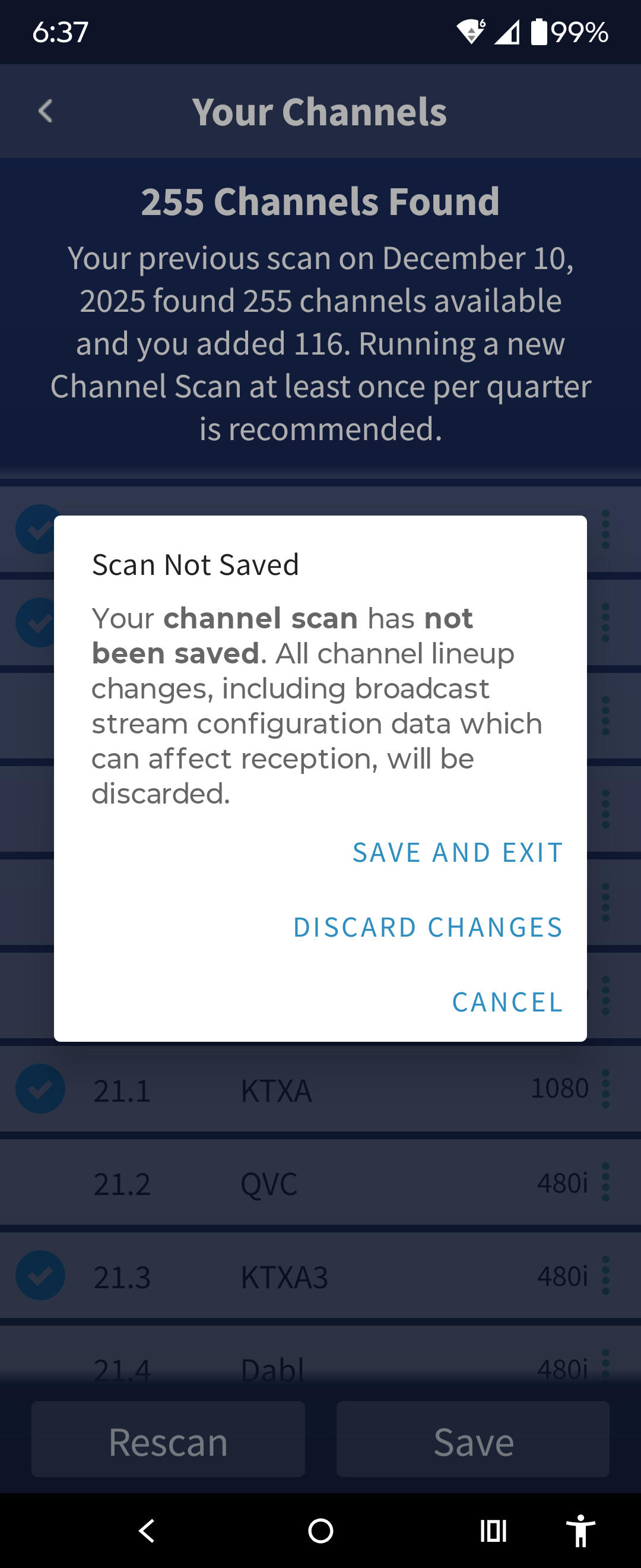 I tried to deselect the new channels and save but the screen darkens and doesn’t seem to be doing anything. Using the back button on the phone gets a warning about a scan in progress. Using the back button on the app returns to the settings screen.