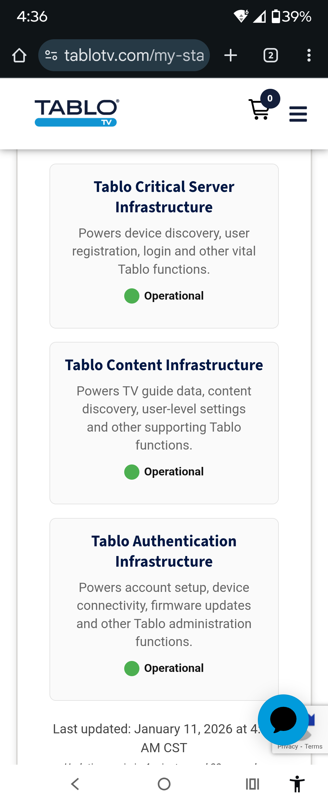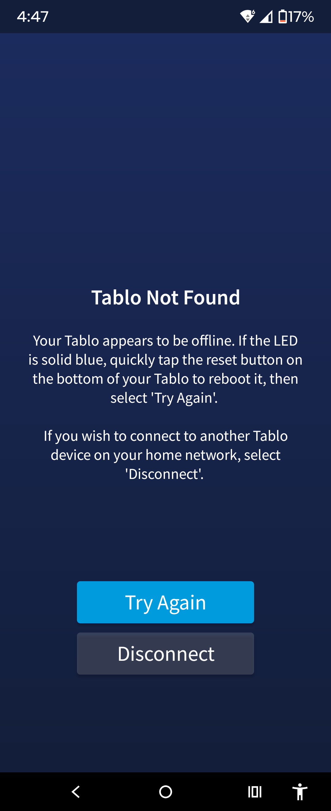 Esp. last night. Seems like there was an issue with either Tablo servers or my connection to them. Tablo eventually went to offline mode, but there was no ability in the interface to choose to record a live feed, and I could not watch one because of that error. Extremely annoying.