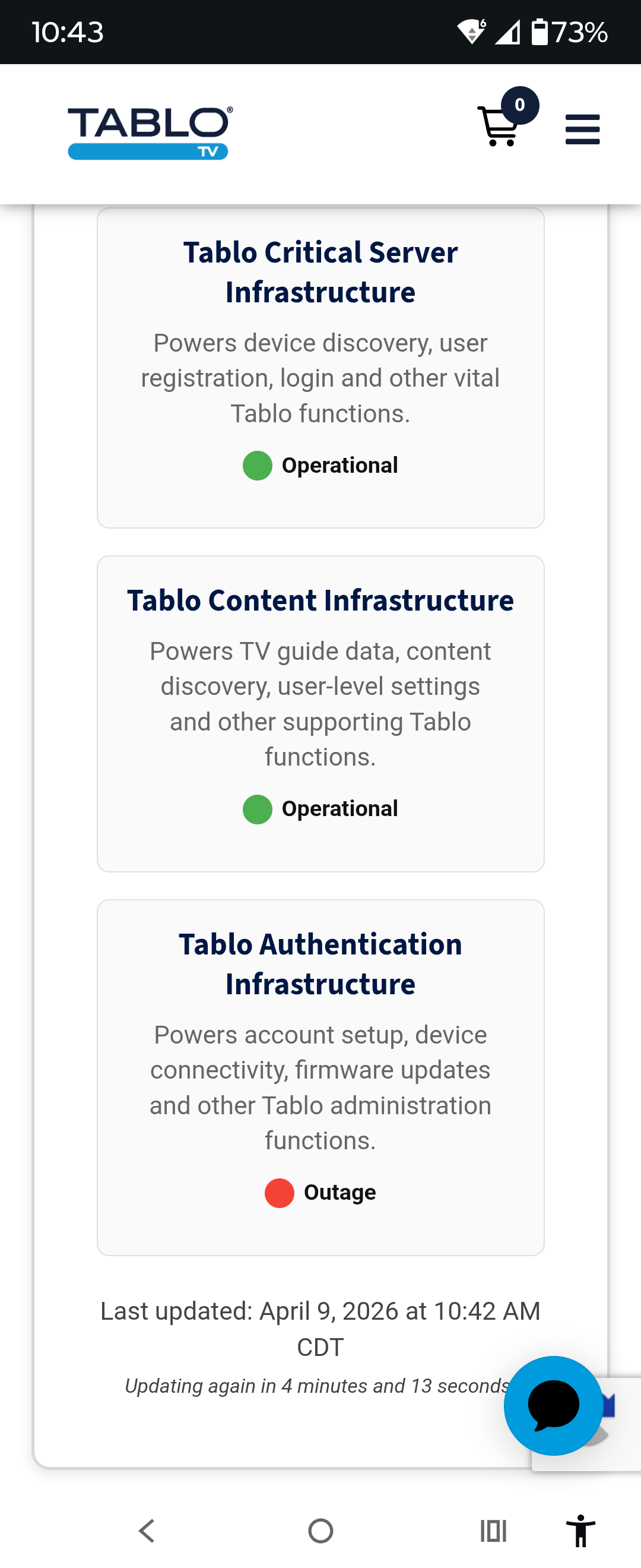 I power cycled my Tablo Gen4 prior to being aware of this outage. The device has not ‘checked in’ for 5 hours.