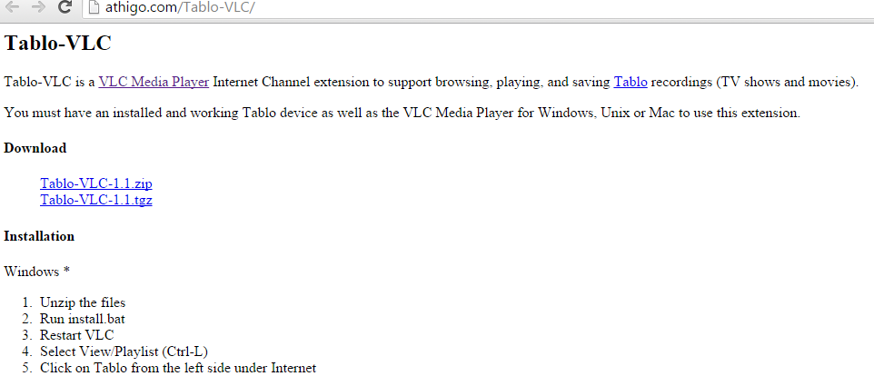 VLC downloaded and installed but could only open the .zip file for Tablo-VLC (What is .tgz anyway?) And when I double click install just get a quick pop up box that disappears just as quick. And when I open VLC I do not see Tablo under internet. Any suggestions?