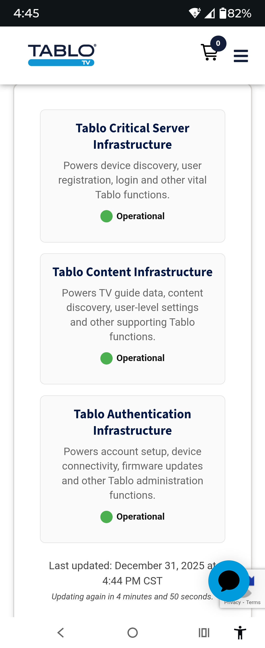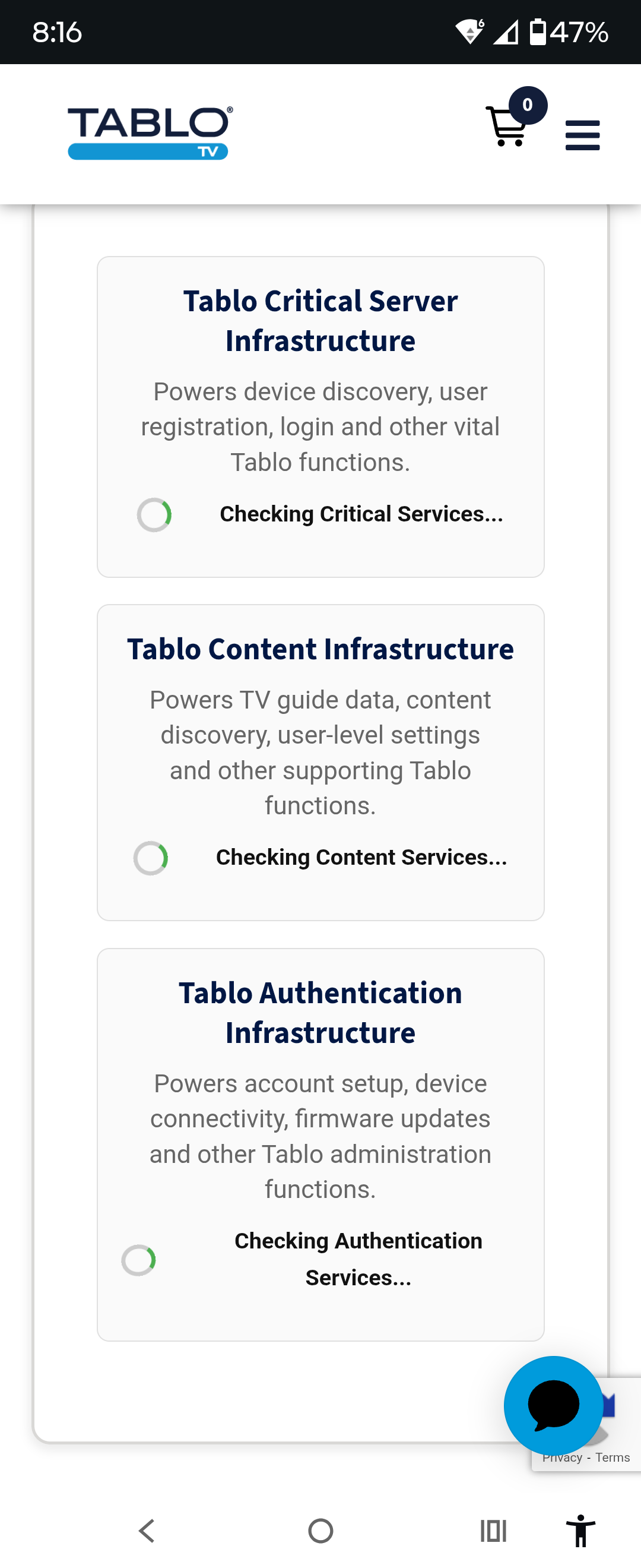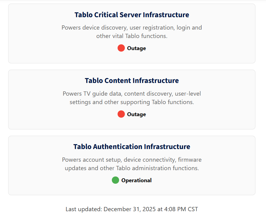 Are the Tablo servers down? I have been trying to access my 4th Gen Tablo for an hour now with no luck. Have tried both resetting and power cycling.