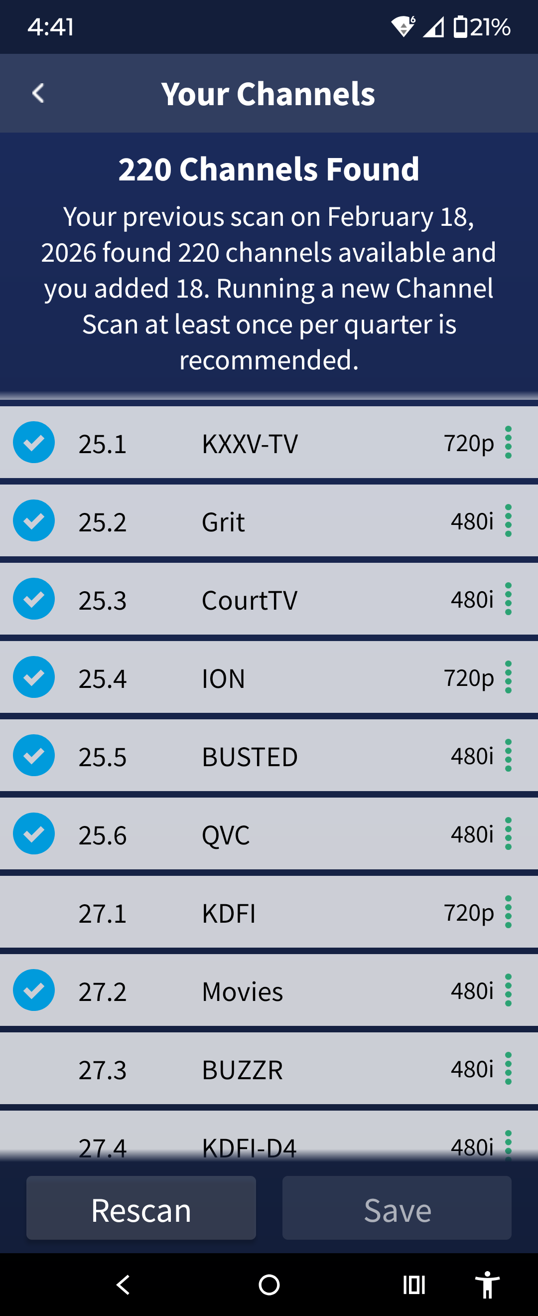 I rescanned and saved using Android mobile, LGTV app and Fire Stick 4k G2 but it doesn’t recognize the RF16 or RF26 signals. It’s not in the Channel Lineup or the Guide and channel count remains the same. I even changed the zip code to rescan. No joy.