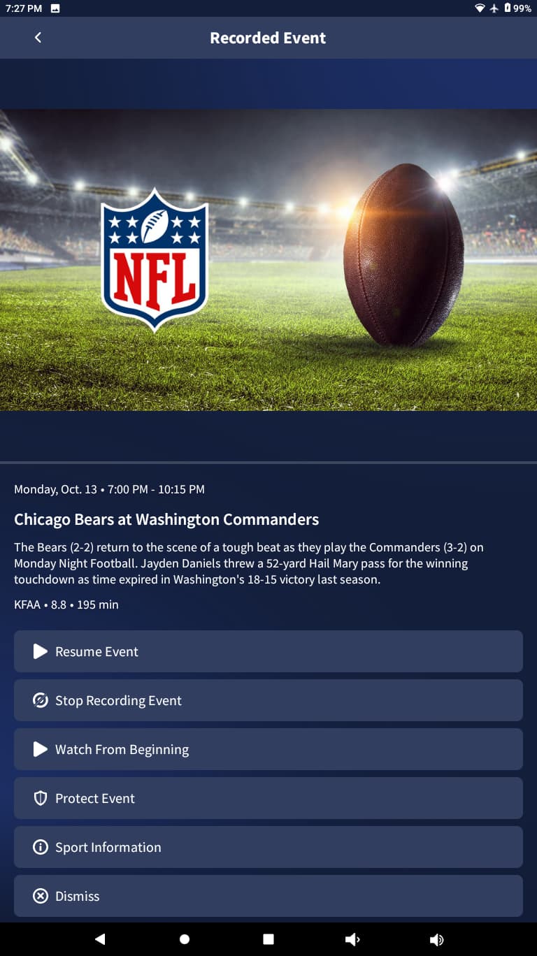 The Monday Night Football game was already on by the time I got home. My wife was watching the game on Tablo Live. It was getting close to 11 minutes left in the 1st quarter. I wanted to catch the banter at the beginning of the game so, I brought Tablo up on my Android phone and went to Library/Sports and selected the game. I selected Watch From Beginning but it acted as though I selected Resume Event. I got the same result with 3 other Android devices with various OS releases.